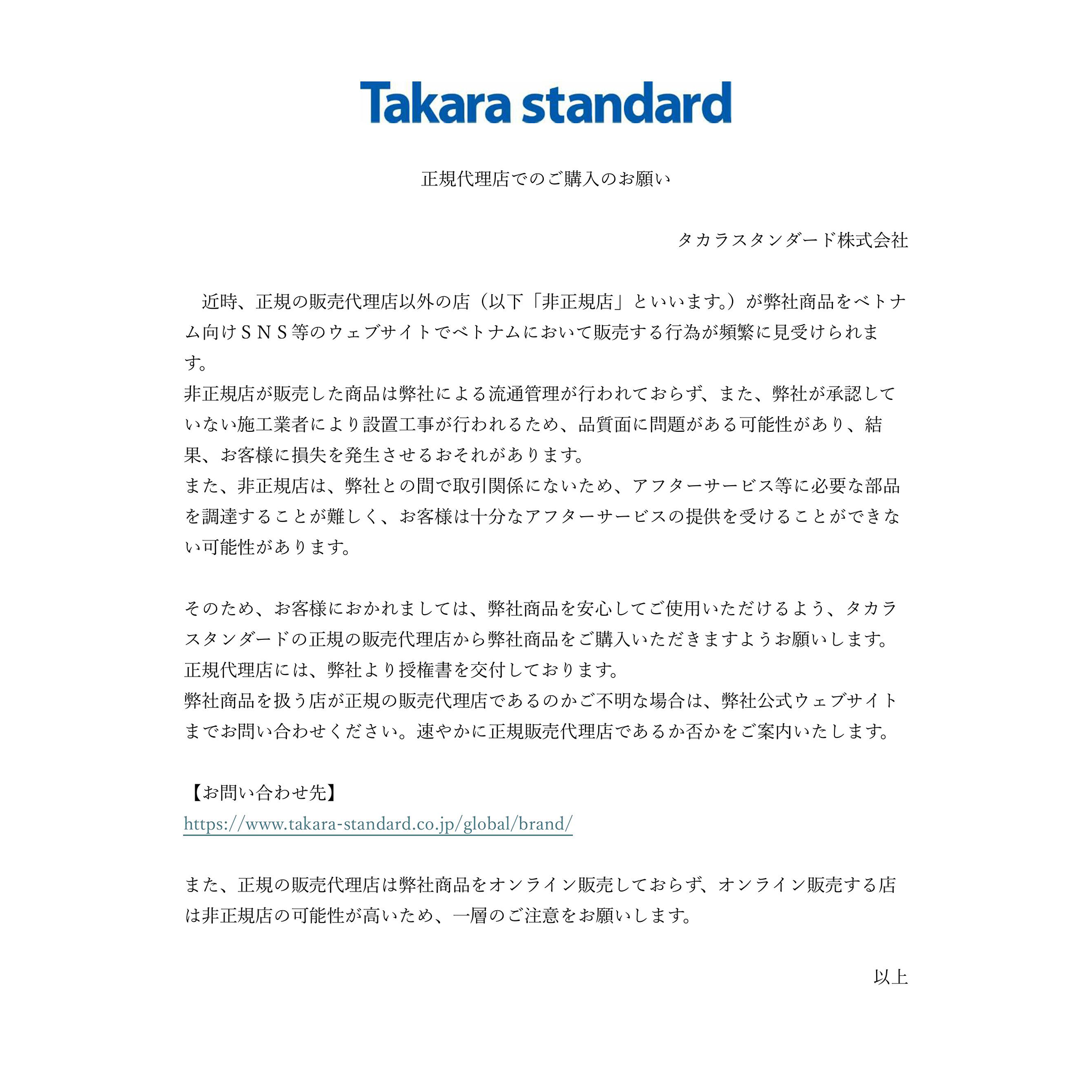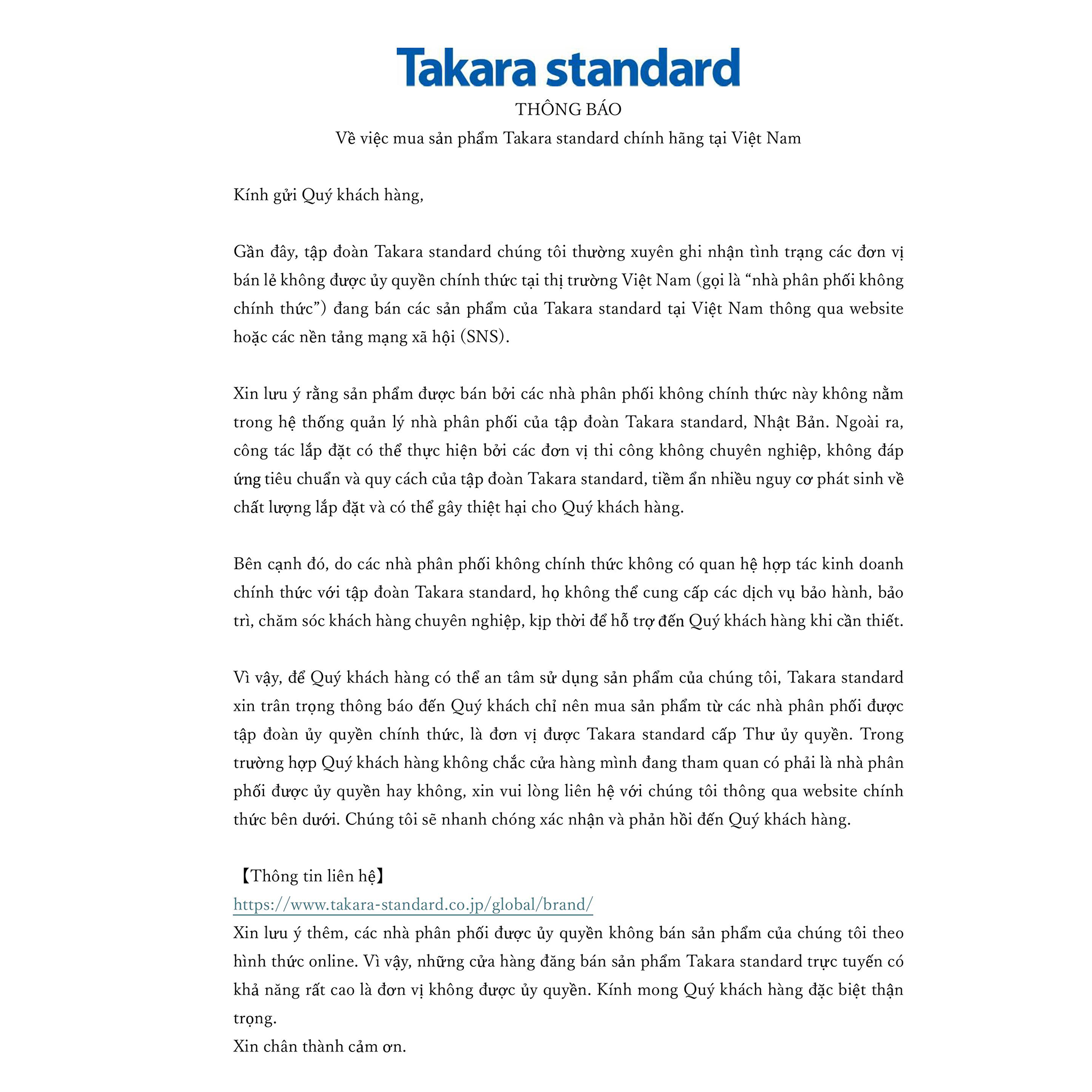THÔNG BÁO CHÍNH THỨC TỪ TẬP ĐOÀN TAKARA STANDARD, NHẬT BẢN